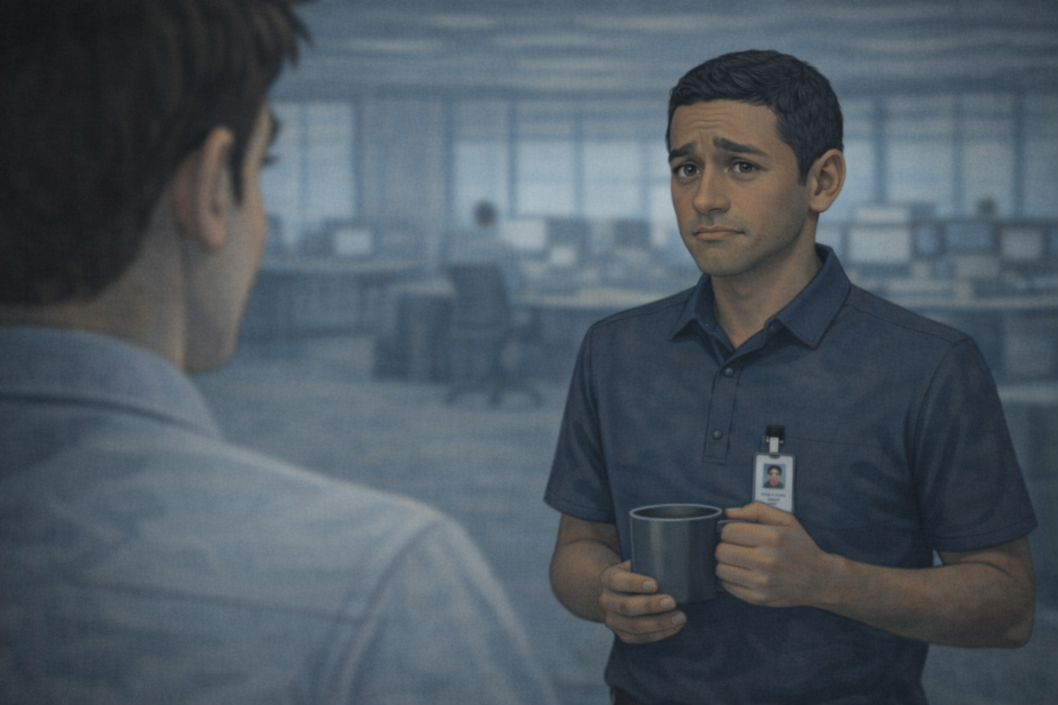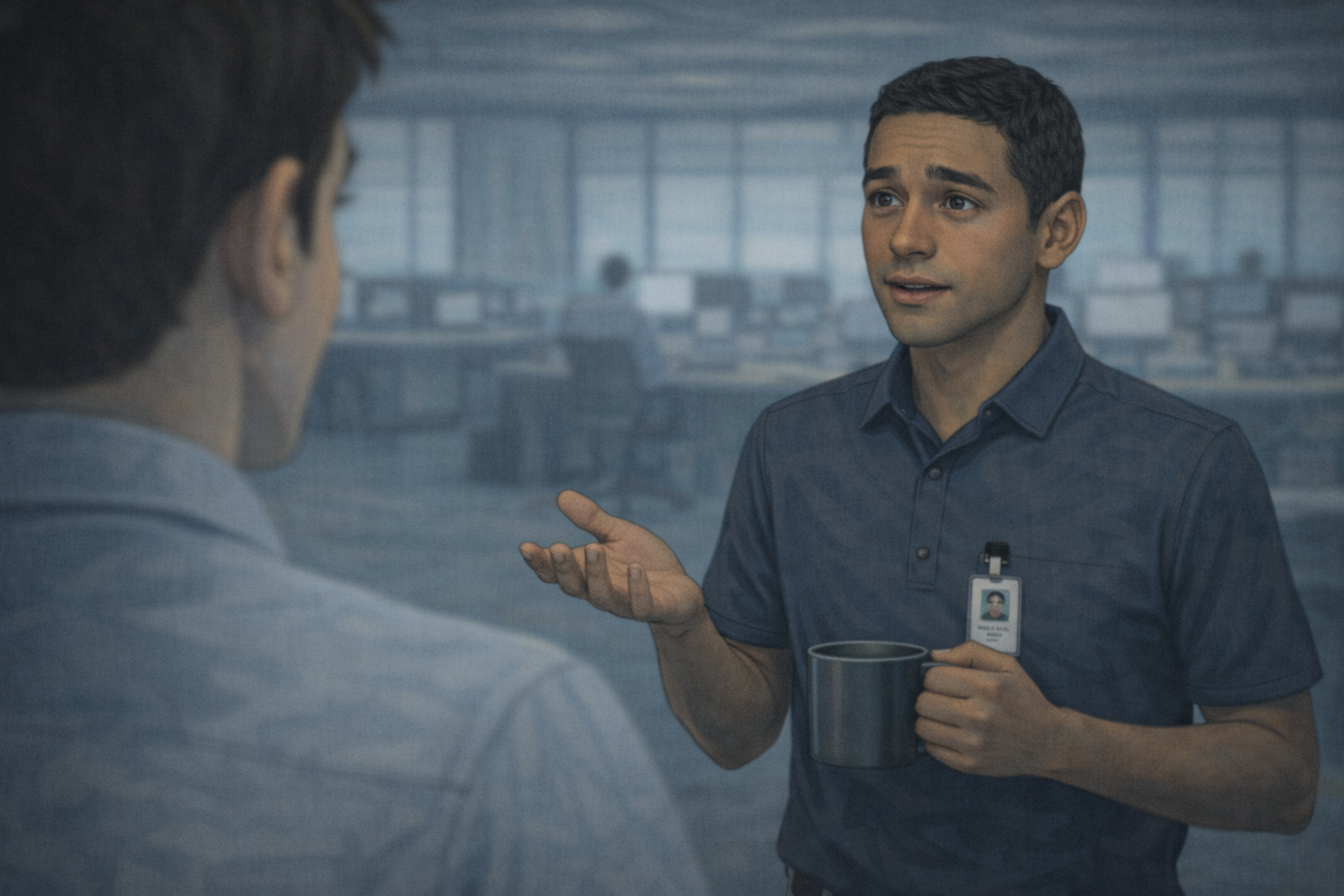 Daniel pours coffee next to Jordan Reyes {Support Engineer}.